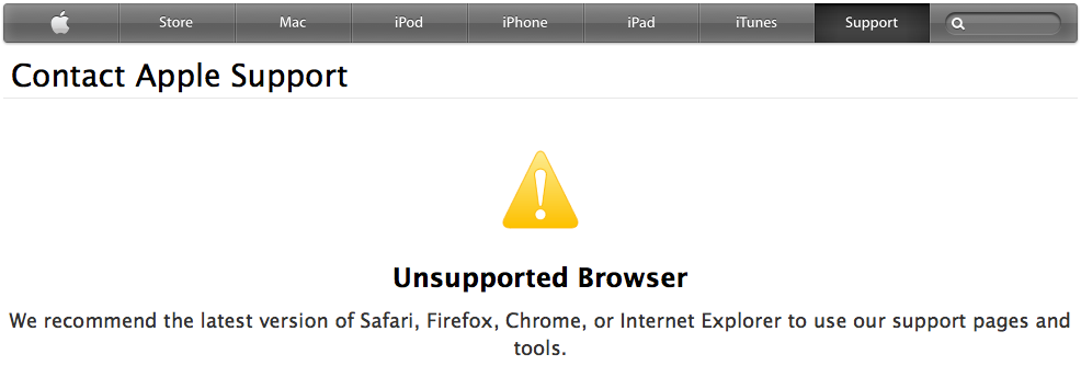 Browsers can impersonate other browsers by setting the User-Agent header, and small-name browsers usually provide that option for getting around these problems. After a couple of tries with iCab, I was able to get through by impersonating Safari. Doing this also has an advantage for privacy; identifying yourself with a little-used browser can greatly contribute to unique identification when you may want anonymity. From the standpoint of good website practices, though, a site shouldn’t be locking browsers out unless there’s an unusual need. Web pages should follow standards so that they’re as widely readable as possible. This is especially important with a “contact support” page.