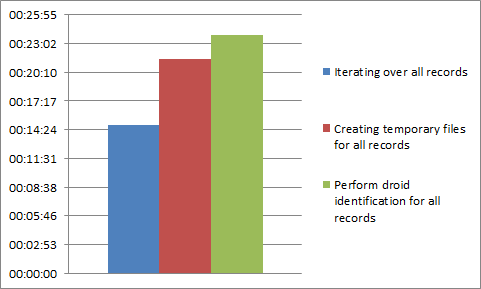 In order to make evident which portion of the overall processing time belongs to each of these processing phases, the Hadoop job is executed three times, once only iterating over the sequence file records, then with creating temporary files, and finally performing the Droid identification. The runtimes for these jobs are shown in Table 4 and illustrated in Figure 3.