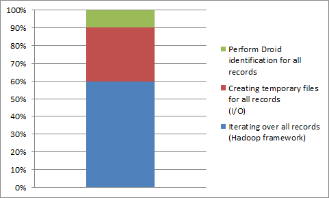 From these results it becomes evident that most of the overall execution time of a Droid identification Hadoop job is spent on the framework iterating over the records of the SequenceFiles and on creating temporary files for the Droid identification.